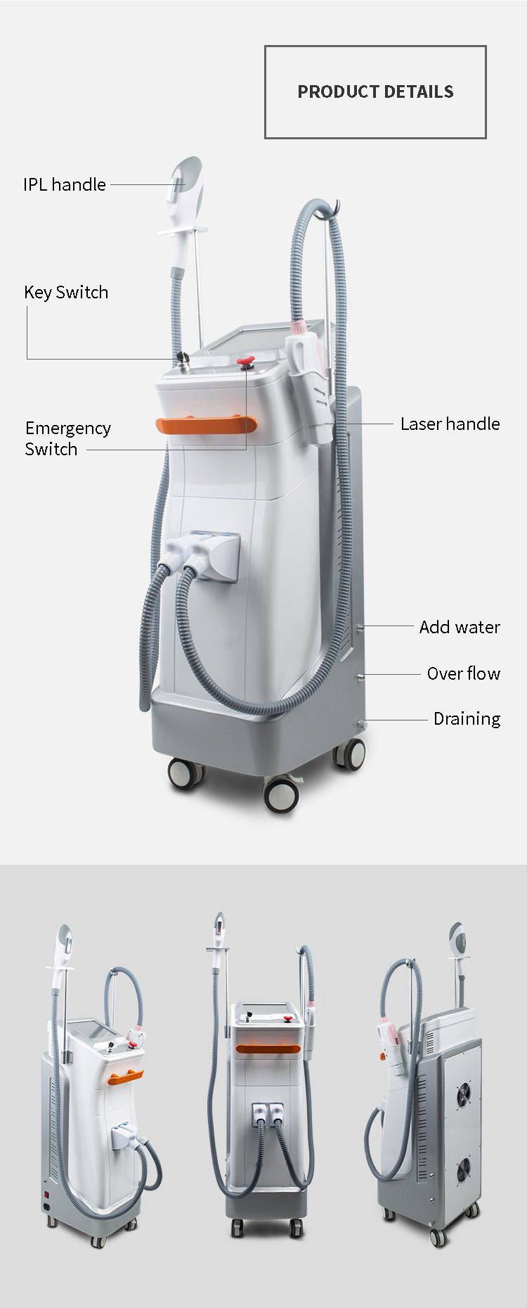 1) IPL (Intense Pulsed Elight) is a kind of light with high energy and broad wavelength, within the range from 530nm to 1200nm. Photothermic and photochemical action will be triggered by the radiation of IPL. On one hand, IPL will promote collagen reproducing and recombining which makes the skin more flexible and smooth. On the other hand, the light with long wavelength can easily pass through epidermis layer and will be absorbed selectively in priority by pathological pigments which will be destroyed by high heat, and get the effect of remove pigmentations, vascular lesions and unwanted hair.